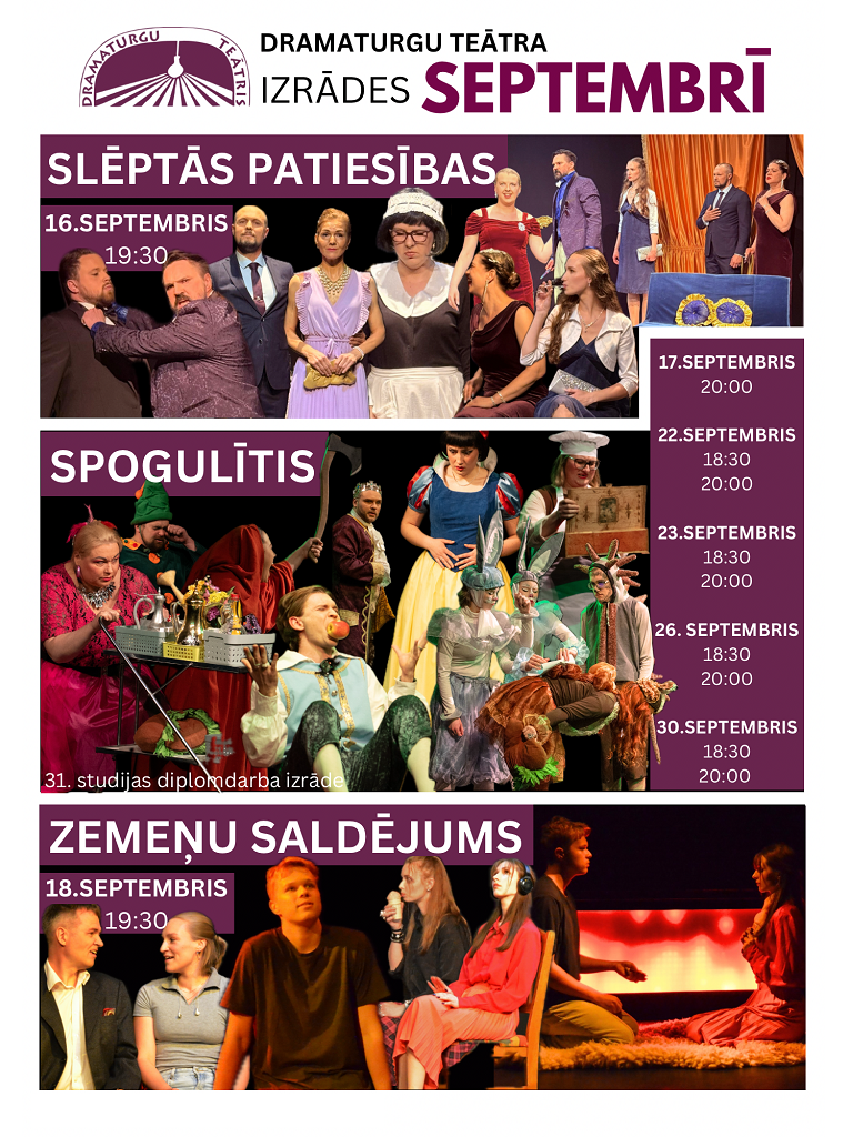 Septembrī teātra repertuārā atgriežas arī dramaturģes un režisores Signes Sēnes detektīvdrāma „Slēptās patiesības”, kura pirmizrādi piedzīvoja šī gada jūlijā. Lugas sižets norisinās greznā namā, kur  uz saviesīgu pasākumu uzaicināti vairāki ietekmīgi cilvēki. Šampanietis plūst, sarunas raisās un gaisā virmo bezrūpība. Viss mainās, kad mājas saimnieks viesus uzaicina piedalīties spēlē, kas galīgi neizskatās pēc parastas spēles. Gaismā nāk slēptas patiesības, likmes aug un nevienam no sanākušajiem vairs nav skaidrs, kurš vakara beigās būs uzvarētājs, bet kurš – zaudētājs.